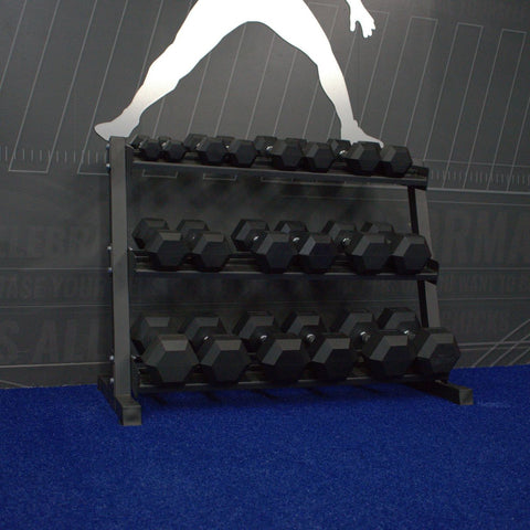 This rack accommodates one pair of hex dumbbells ranging from 5 to 50 lbs each. With an extra-wide 42.5" rack space, there's ample room on every tier.